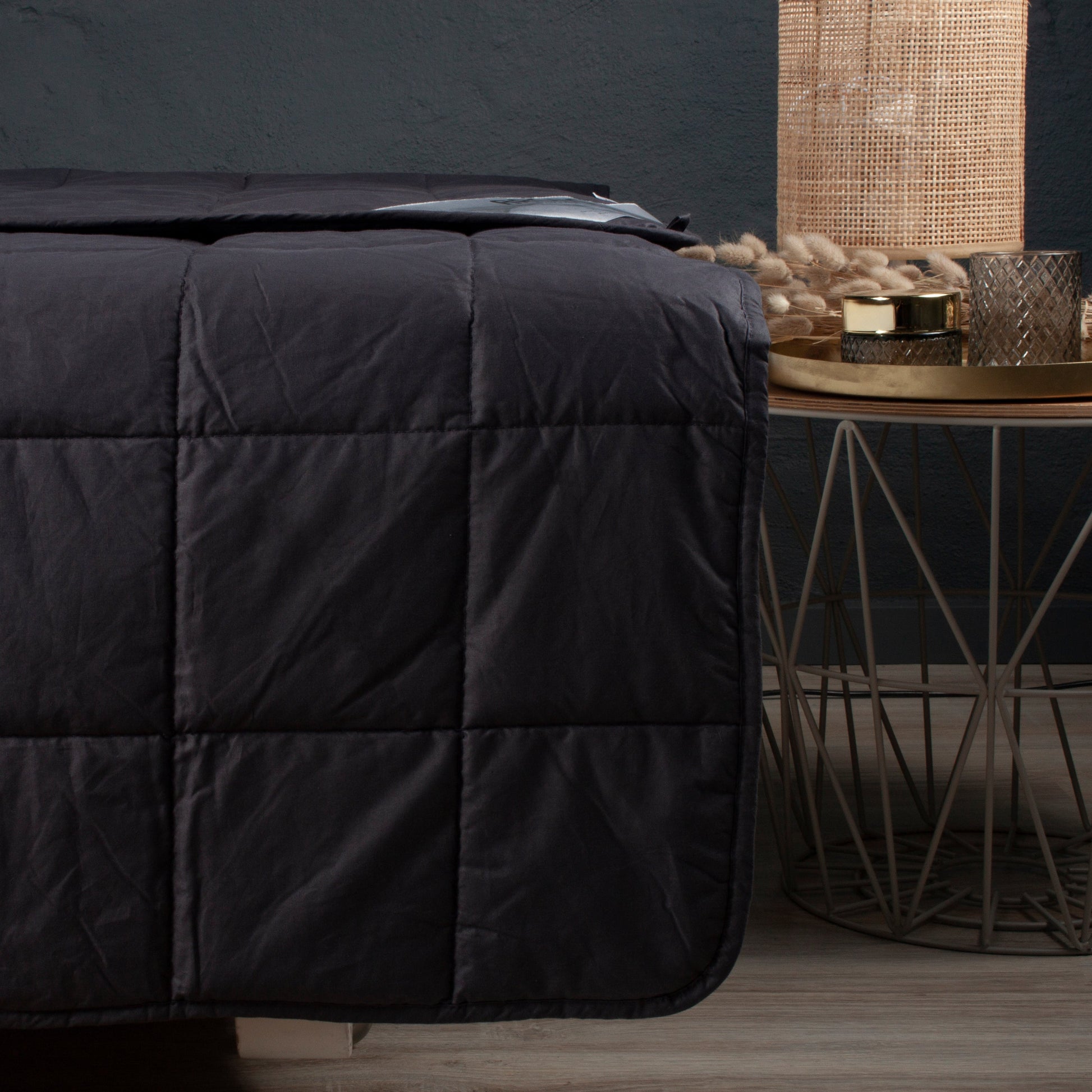 Dynen er fyldt med 95% glasperler og 5% polyesterfibre, som er opdelt i kassetter, der sikrer en jævn fordeling af vægten. Tyngdedynen bør veje omkring 7-12% af din krops vægt. Derfor anbefales denne dyne kun til voksne.