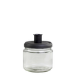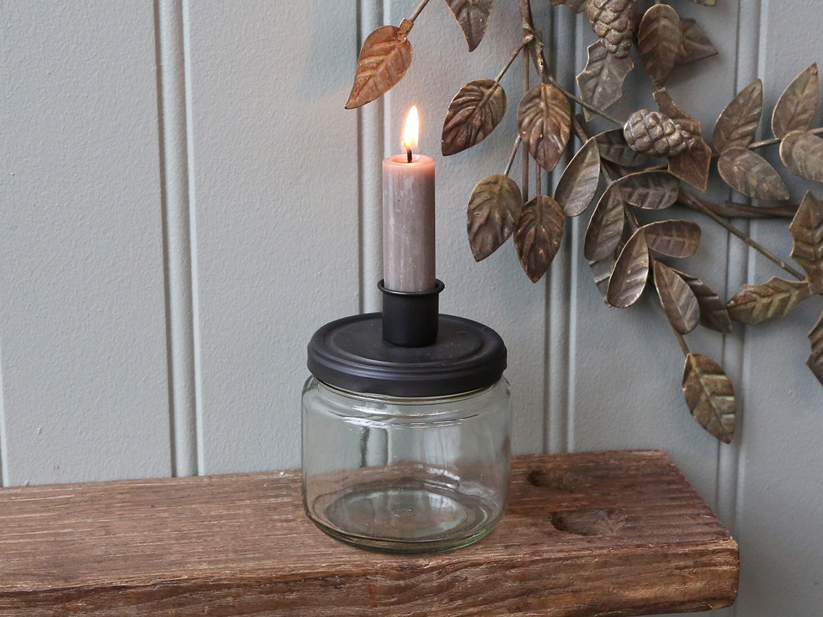 Fin lysestage i glas med sort skruelåg med holder til et kronelys.