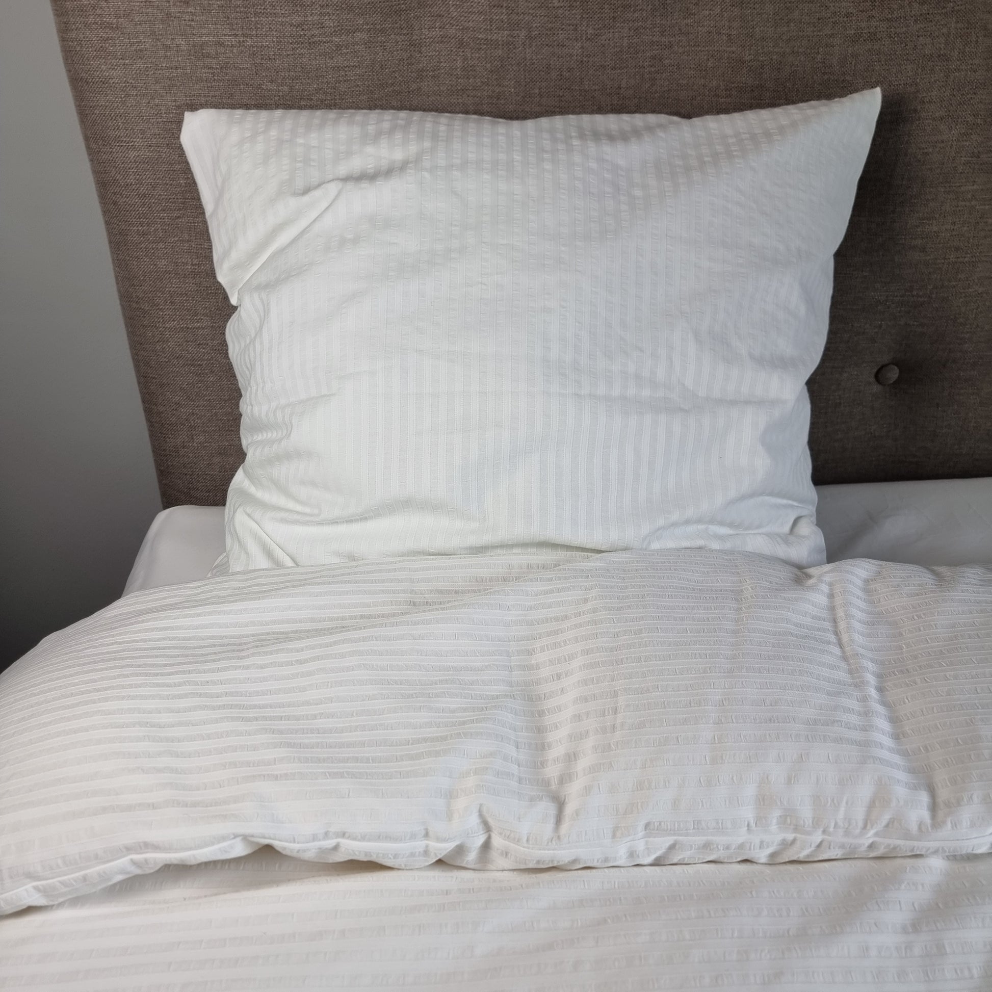 - Kraftig og slidstærkt sengetøj med et stribet mønster.