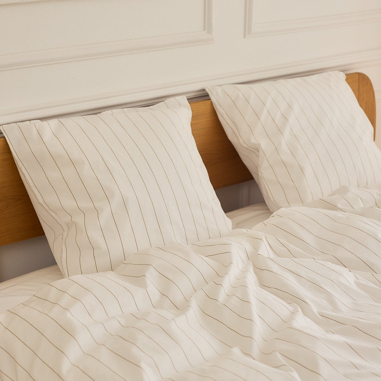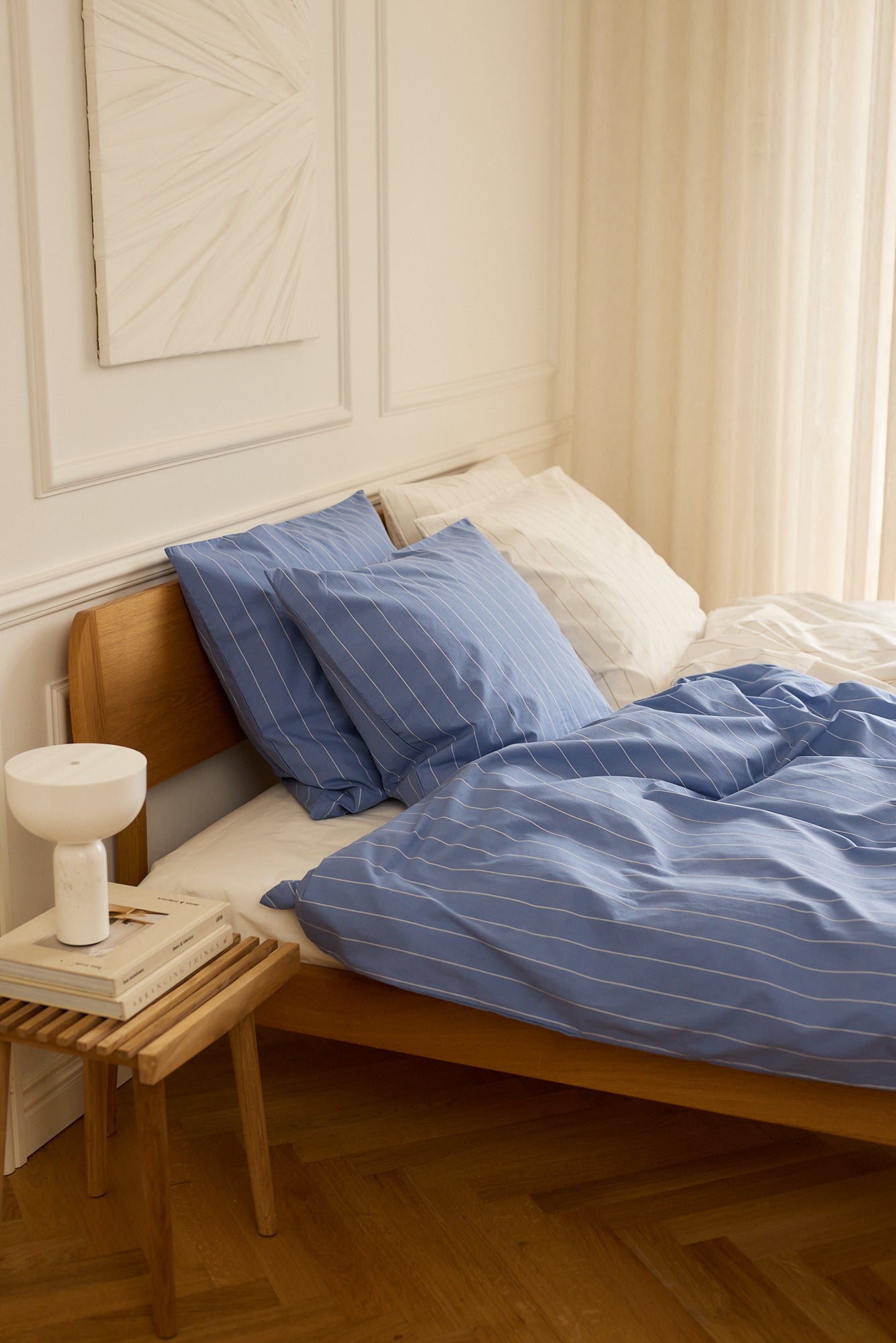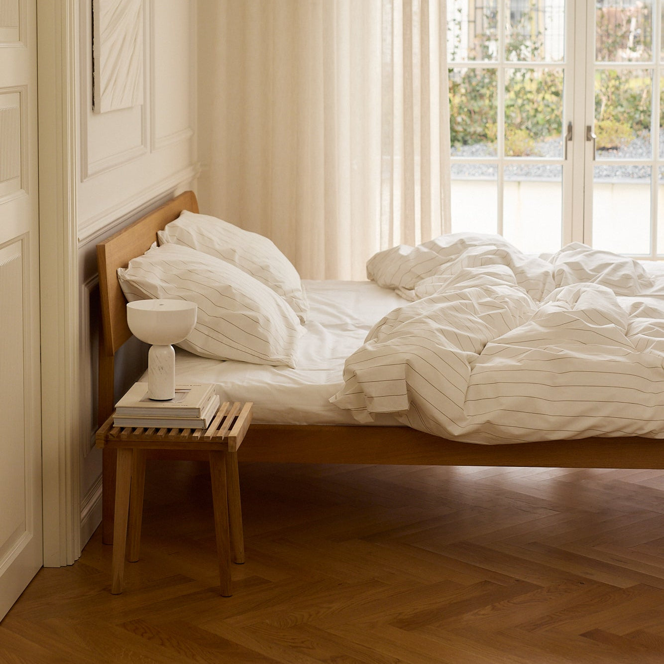 Forkæl soveværelset med Bristol sengelinned fra Nordisk Tekstil, fremstillet af 100% økologisk bomuld i en lækker, tæt percalevævning. Det giver et blødt, lækkert og mat udtryk, som føles luksuriøst mod huden. Det stilrene design med de tynde striber skaber et elegant og roligt look i dit soveværelse.