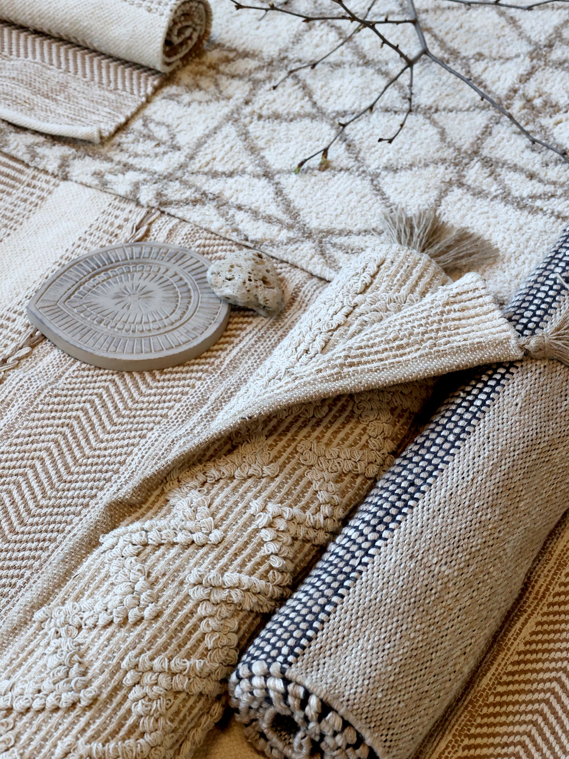 Blødt og smukt tæppe fra Chic Antique. Tæppet er vævet af genanvendt overskudsgarn og har en varm og naturlig farve.